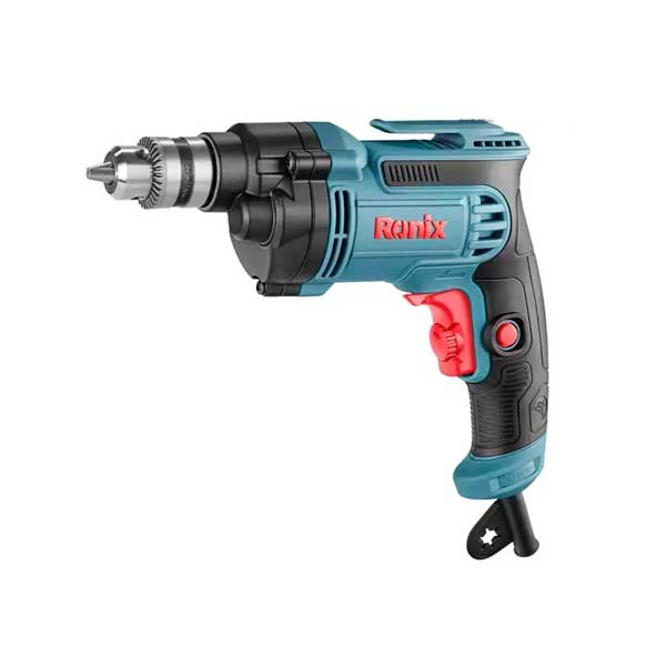 دریل رونیکس مجهز به کلید دور متغیر با قابلیت راستگرد و چپگرد و سه نظام آچاری 10 میلیمتری است. این ابزار برقی دارای موتور قدرتمند 500 واتی و کلید گازی ضدغبار جهت تنظیم دقیق سرعت مته میباشد.